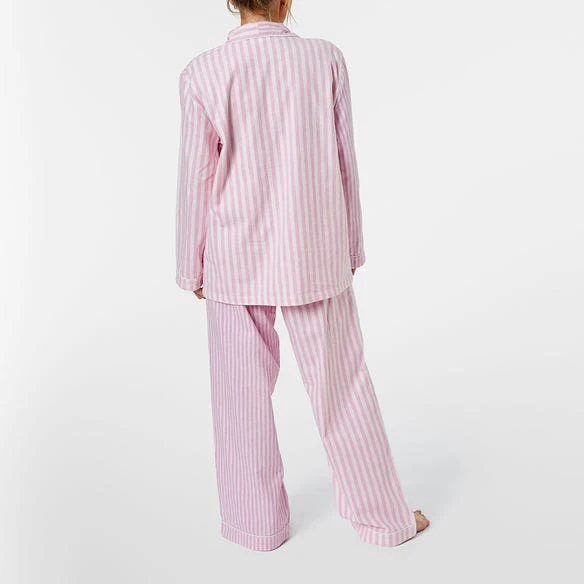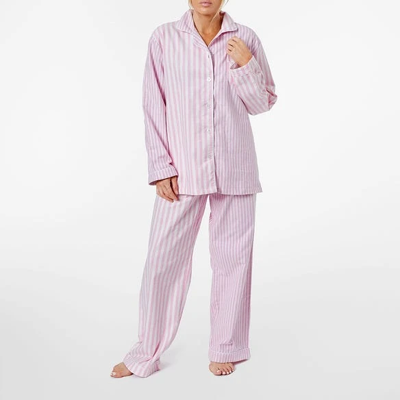 Embrace the cooler months with our snuggly Anni flannelette pyjamas. Beautifully soft to the touch, these warm pyjamas have been crafted from cotton flannelette, brushed on both sides for extra softness. Featuring a stylish stripe design in soft shades of pink, these pyjamas are the perfect winter companion. Available in three sizes, this set is complete with an elasticated drawstring waist and a button-down shirt with collar and pocket details.