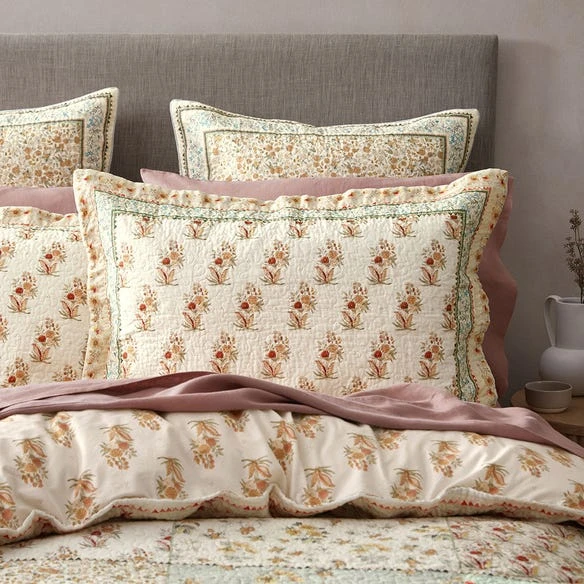 Introduce pattern to your bedroom with the Ashwin quilt cover. Quilted for added texture, this quilt cover features a patchwork design with floral details and an intricate border, creating a soft vintage-inspired style. Finished with a filled piping trim and printed reverse. Coordinate with European pillowcases for a complete look.