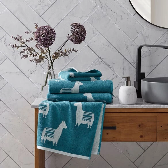 Add a playful style to your bathroom with the Leroy Llama bath towels.