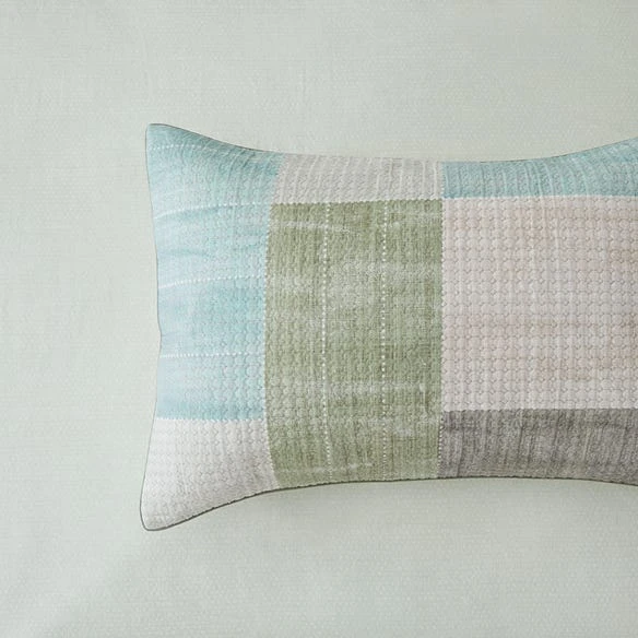 Create a contemporary bedroom style with the Mondrian quilt cover in green. Crafted from cotton percale, this design features a geometric patchwork pattern in green and neutral shades. Quilted with a small diamond stitch and finished with a filled piping trim. Coordinate with European pillowcases to complete the look.